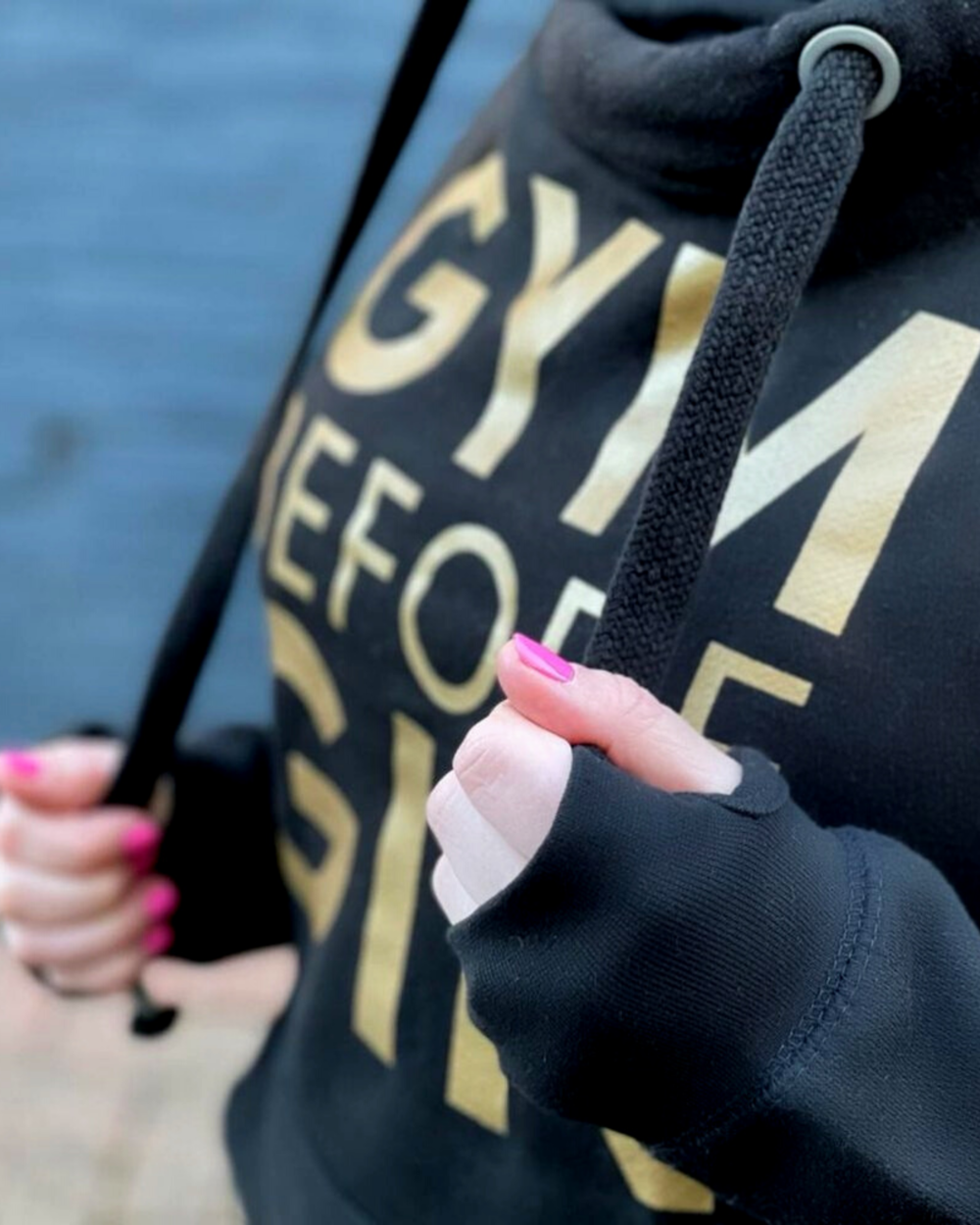 The gold foil statement print lettering adds glamour whilst retaining the casualness of your statement hoodie making it versatile enough for ginning with friends, as well as gyming.
